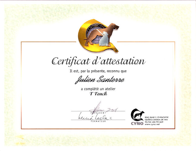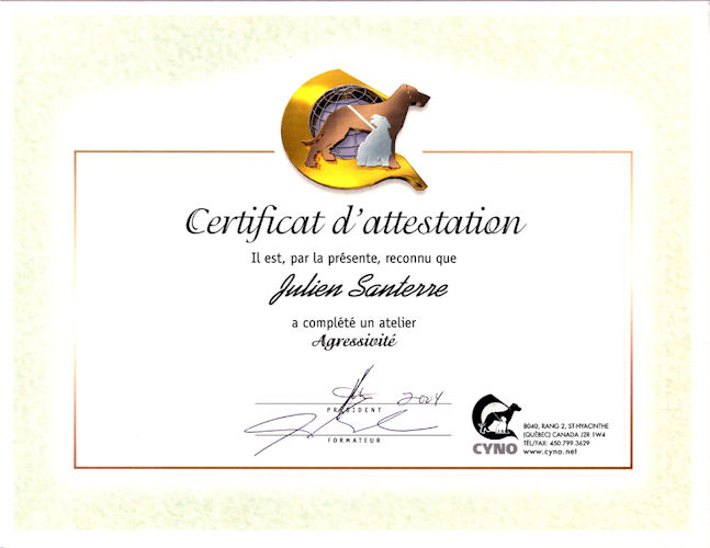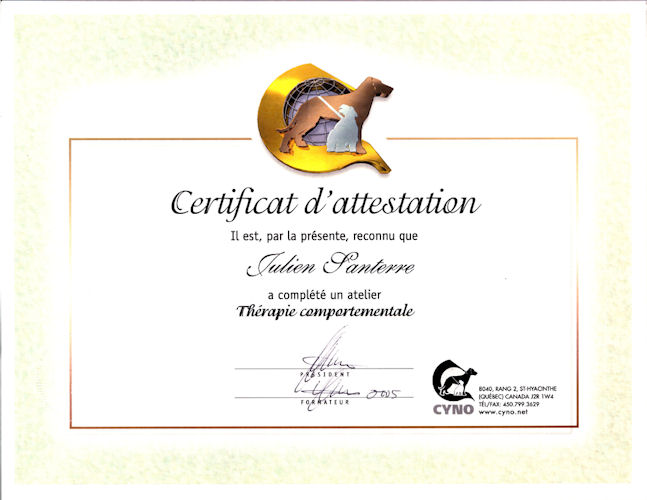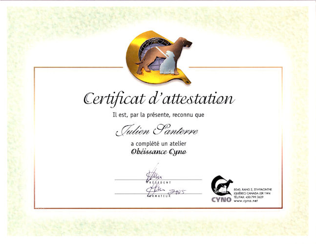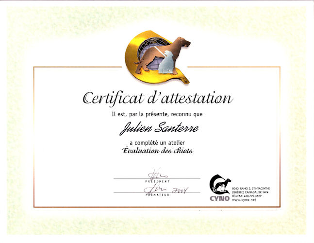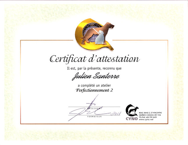 En 2003, j'ai commencé à étudier à la Certification Cyno Professionnel Canadienne, afin d'améliorer mes connaissances et compétences en comportement canin, nutrition et élevage. J'ai terminé mes études en 2005.